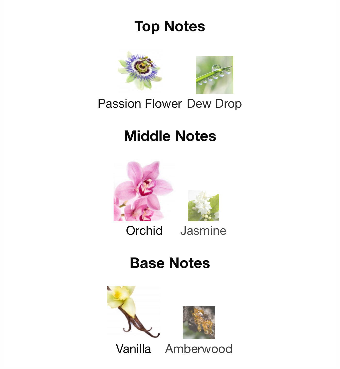 It opens with a refreshing combination of passionflower and dewdrop, creating a light and airy introduction. The heart reveals a bouquet of orchid and jasmine, adding a creamy and elegant floral depth. The base is warm and comforting, featuring vanilla and amberwood, leaving a gentle and lasting trail.