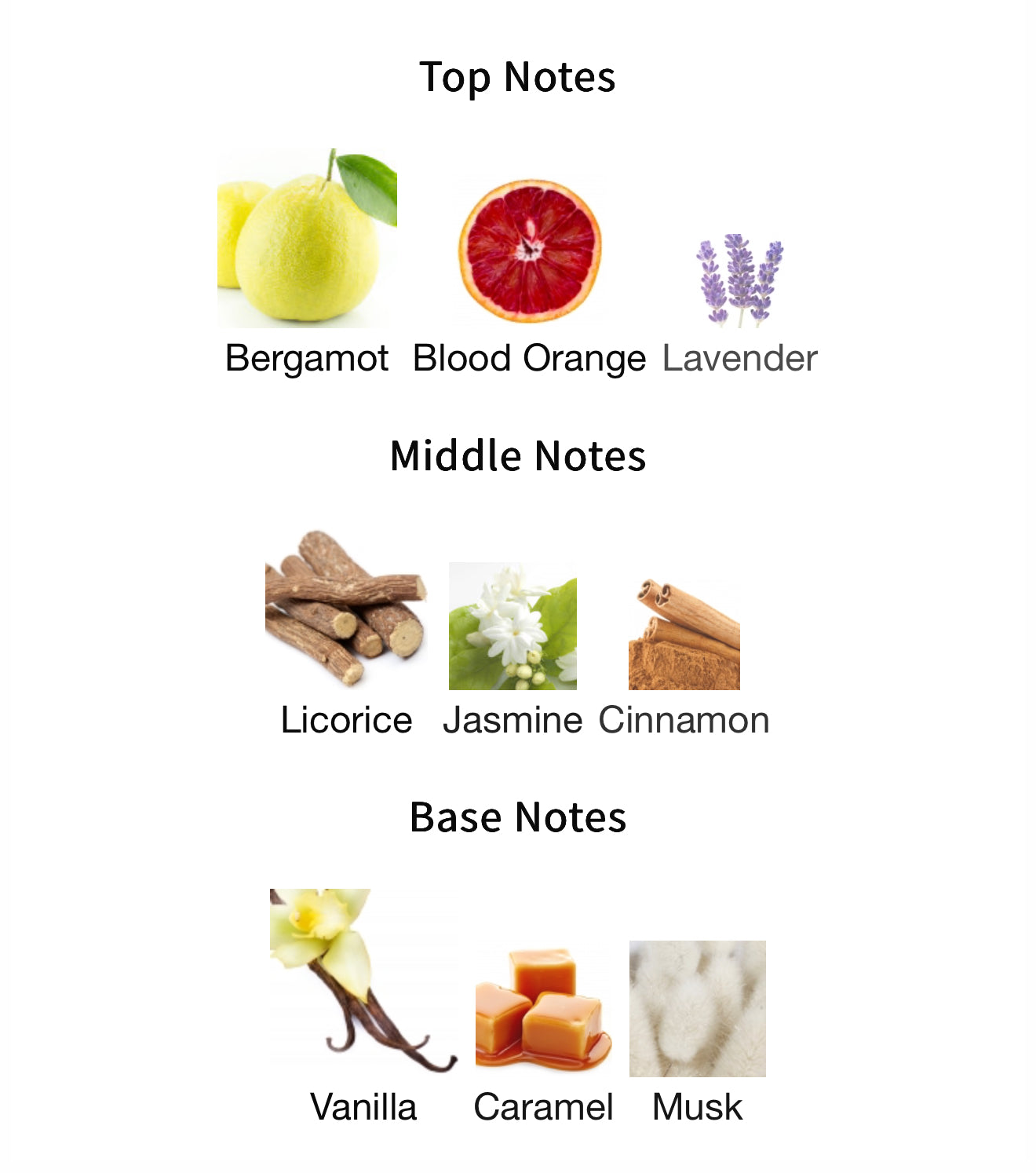 It opens with a sparkling trio of bergamot, blood orange, and aromatic lavender, giving you a zesty, slightly herbal brightness that feels uplifting and luxurious. The heart unfolds into a warm, spiced bouquet of licorice, jasmine, and cinnamon, wrapping you in a soft, sweet embrace. Finally, the base reveals an indulgent swirl of vanilla, caramel, and musk, creating a smooth, addictive finish that stays close to the skin like a silk scarf.