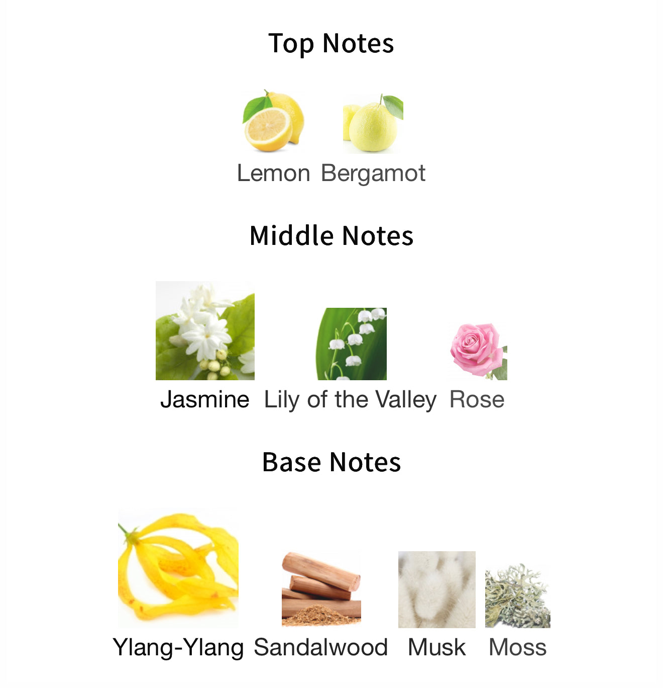 - Base Notes: Ylang-Ylang, Sandalwood, Musk, Moss