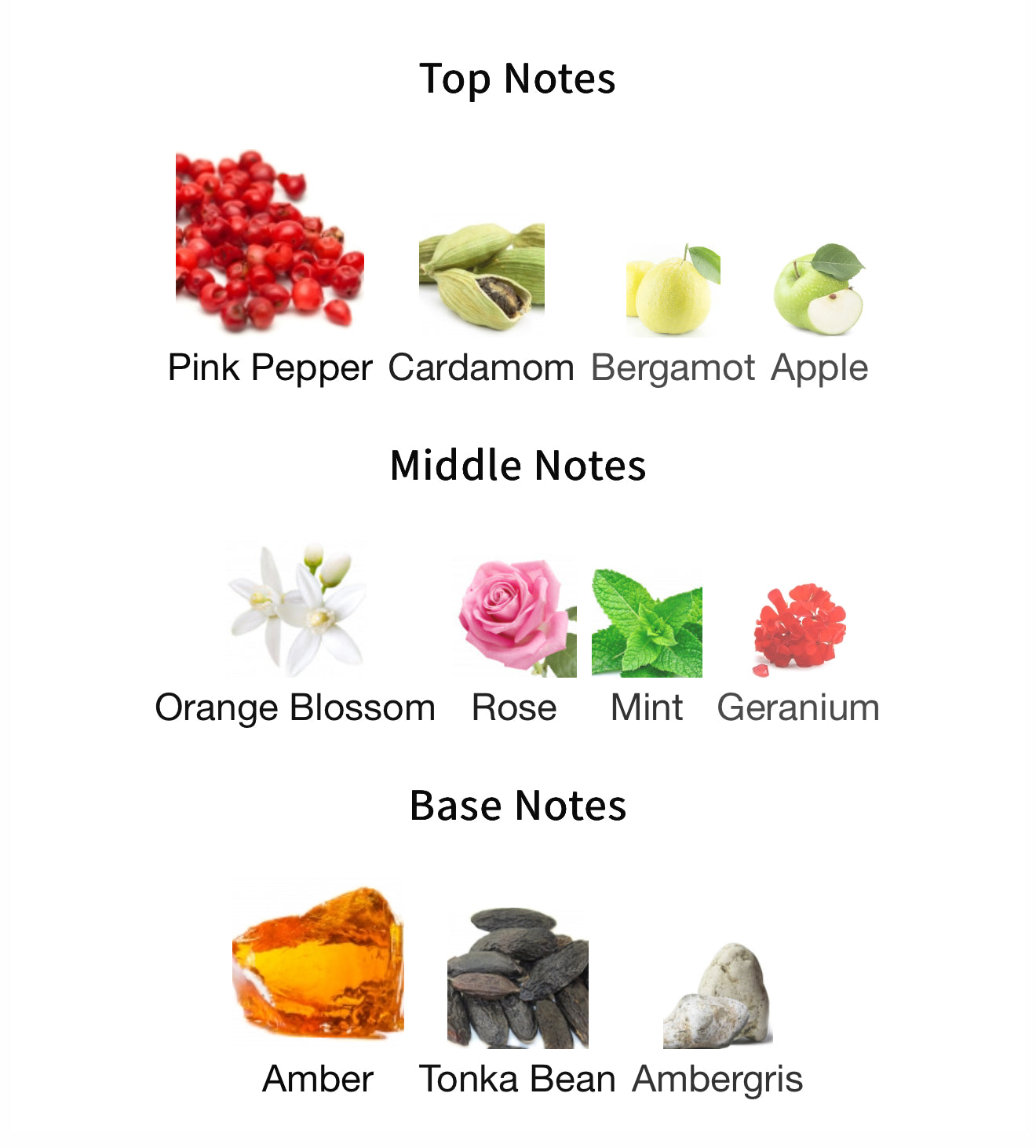 - Top: Pink Pepper, Cardamom, Bergamot, Apple