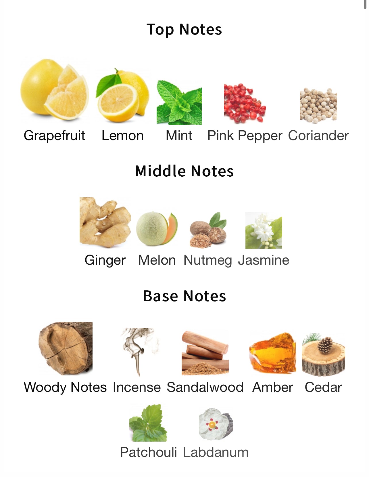 (grapefruit, lemon, mint, spices, incense, sandalwood — modern fresh-woody-spicy DNA)