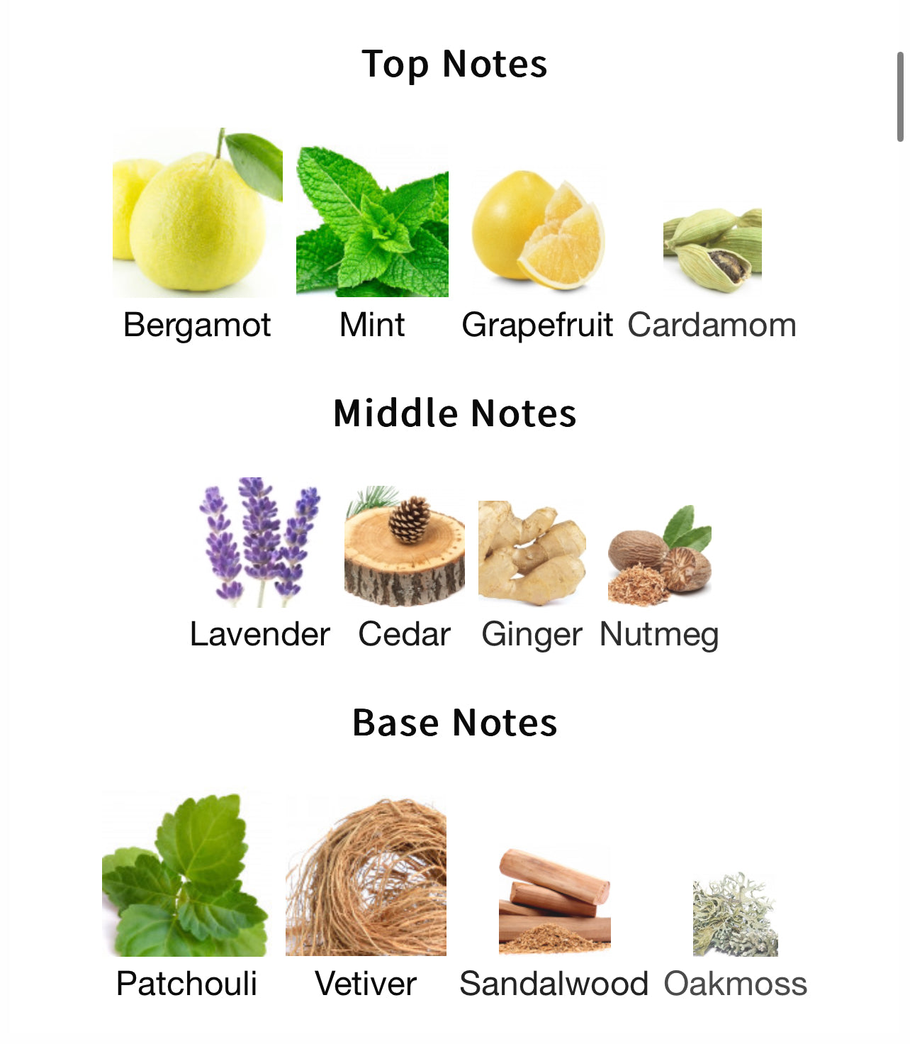 (bergamot, grapefruit, mint, woods, lavender, cardamom — fresh, woody, modern masculine)