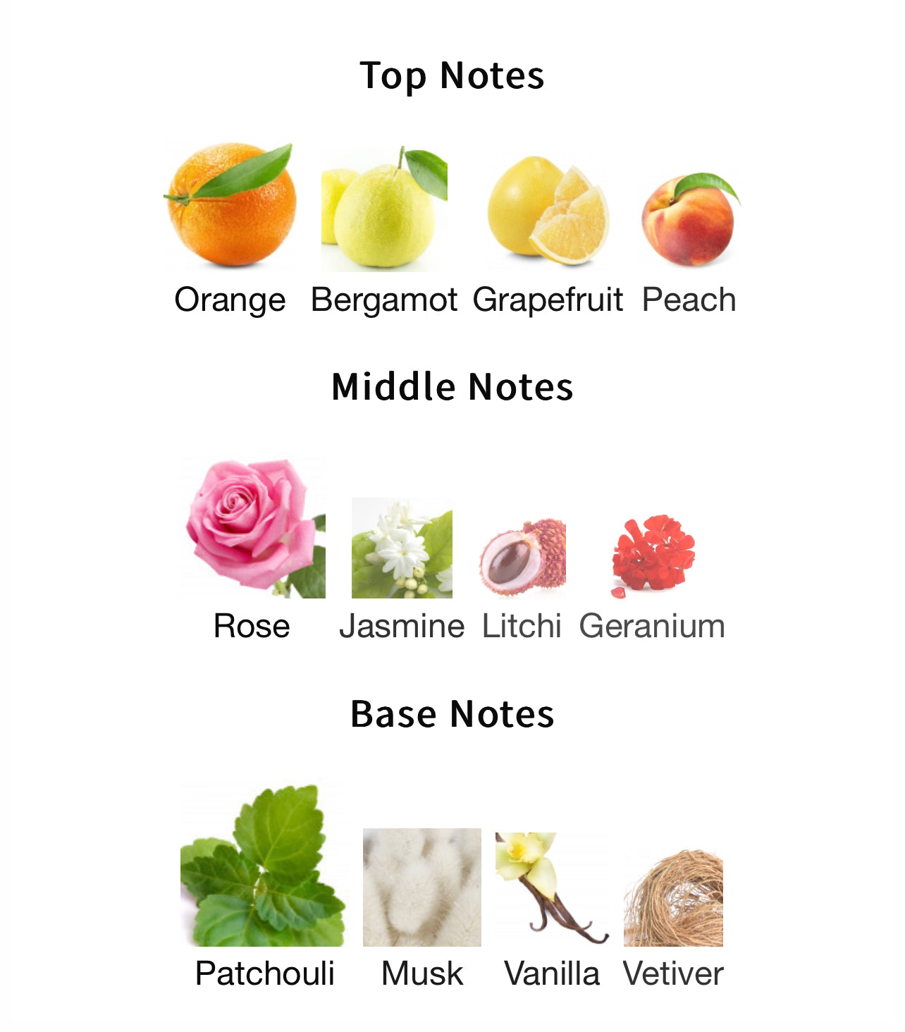(orange, bergamot, grapefruit, peach, rose, jasmine, litchi, vanilla, patchouli — fruity, floral, feminine, elegant)