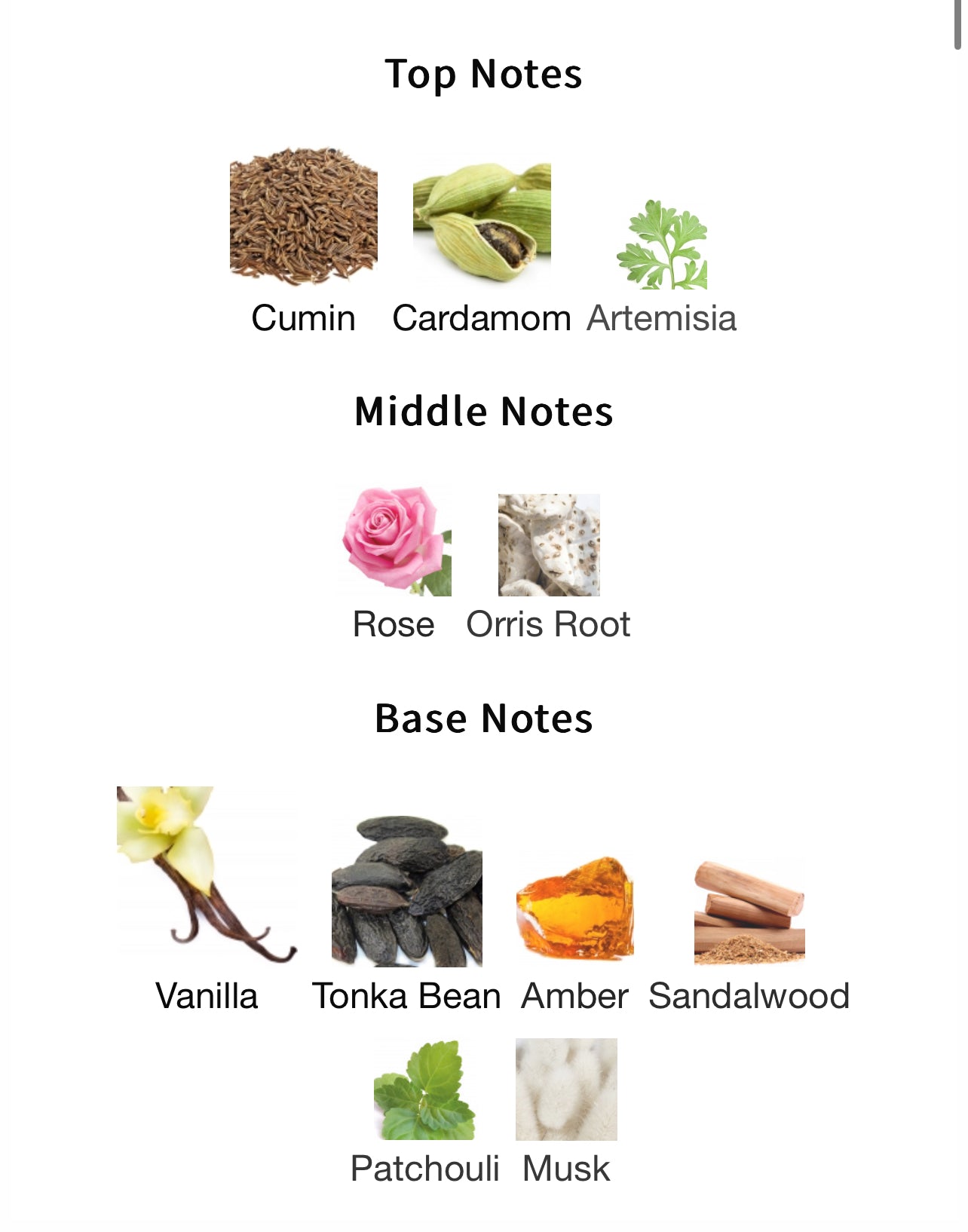 (cumin, cardamom, rose, vanilla, patchouli — spicy, floral, and sweet)