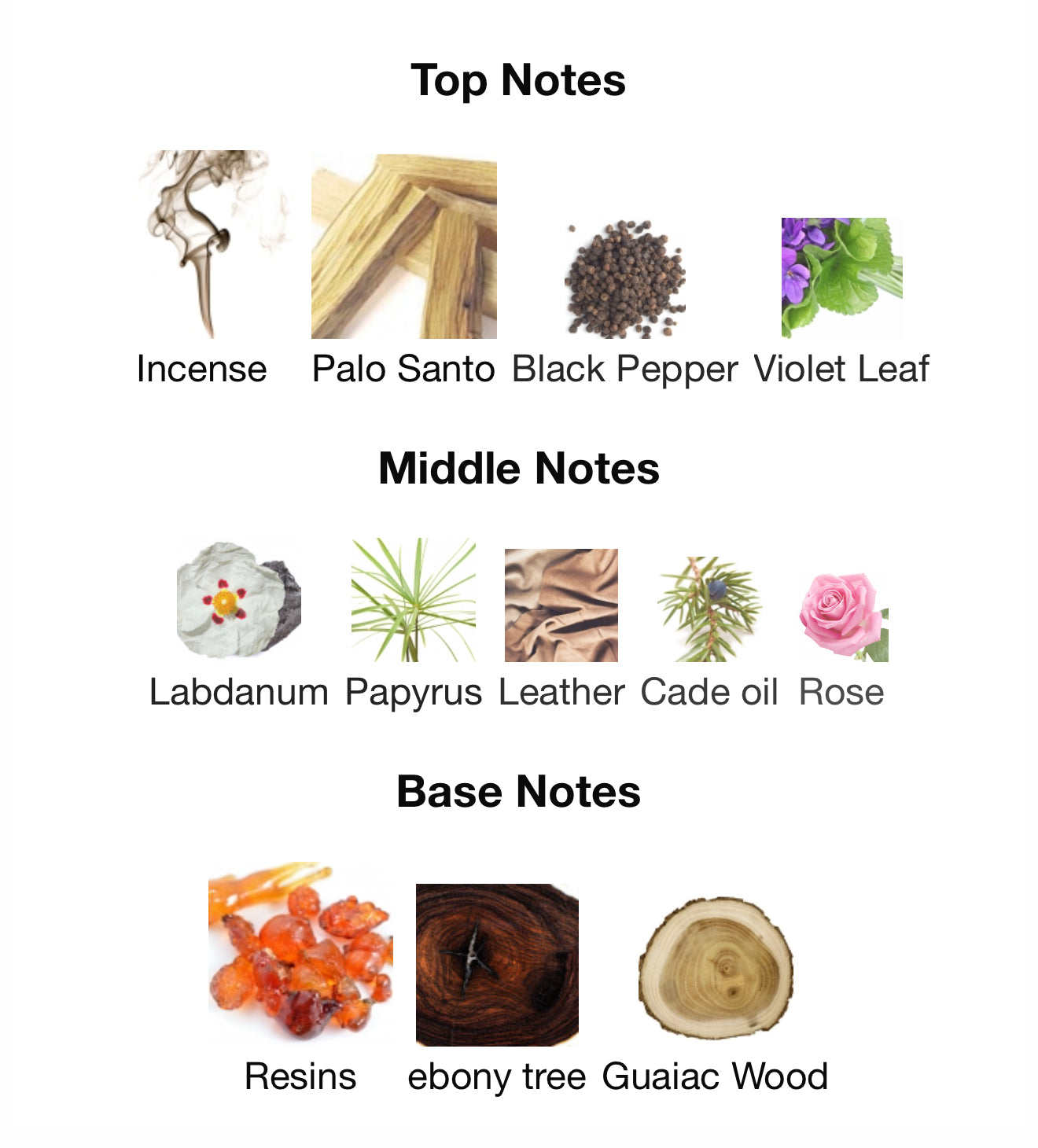 It opens smoky and spicy with incense, palo santo, black pepper, and green violet leaf. The heart develops an earthy and resinous depth: labdanum, papyrus, smooth leather, smoky cade oil, and a touch of rose. The base is dense, woody, and long-lasting — with warm resins, dark ebony wood, and rich guaiac wood completing the scent’s dark, luxurious signature.