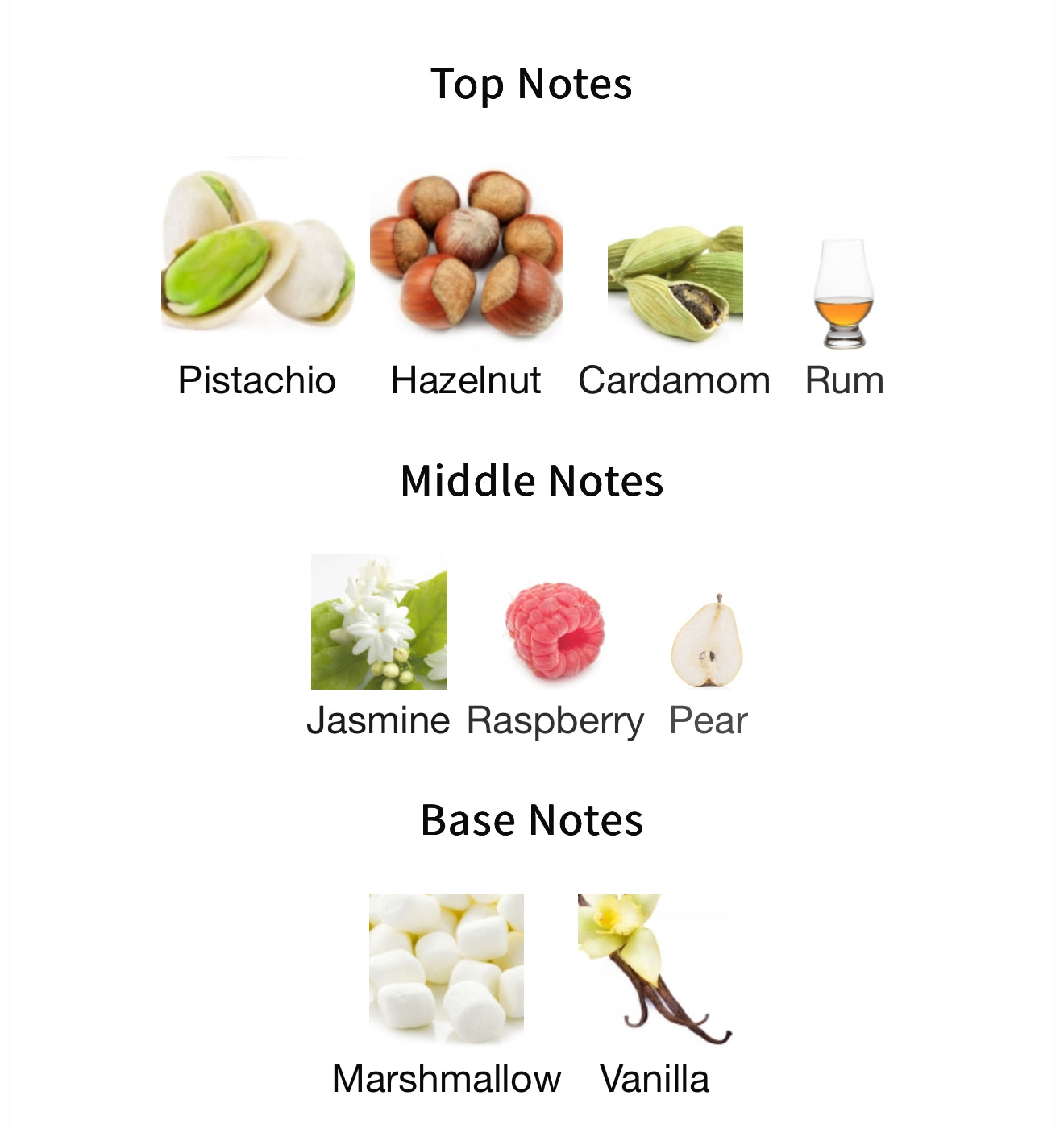 - Top Notes: Pistachio, Hazelnut, Cardamom, Rum