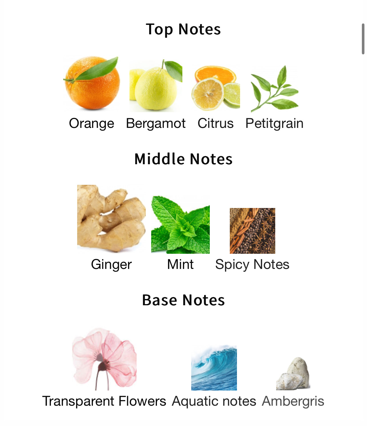 It opens with zesty citrus, bergamot, and orange, blending into a minty-spicy ginger heart. Subtle floral and aquatic tones glide underneath, supported by marine ambergris and a polished transparent floral base. It’s crisp, refreshing, and has an understated luxury feel.