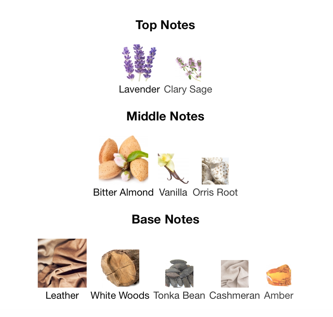 (Lavender, Clary Sage, Bitter Almond, Vanilla, Orris Root, Leather, White Woods, Tonka Bean, Cashmeran, Amber — aromatic, gourmand, and leathery)