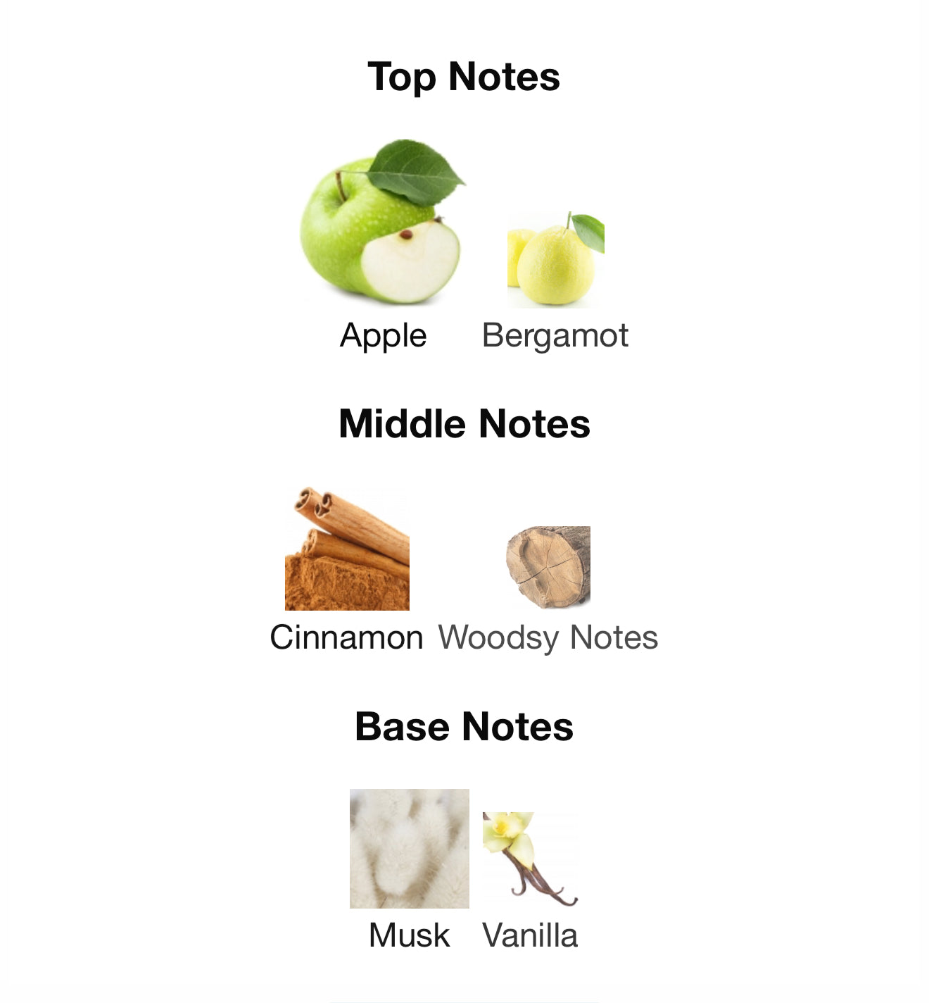 It opens with a lively mix of apple and bergamot, providing a crisp and fruity introduction. The heart reveals cinnamon and woody notes, adding a spicy and aromatic depth. The base is a warm combination of musk and vanilla, leaving a lasting and comforting trail.