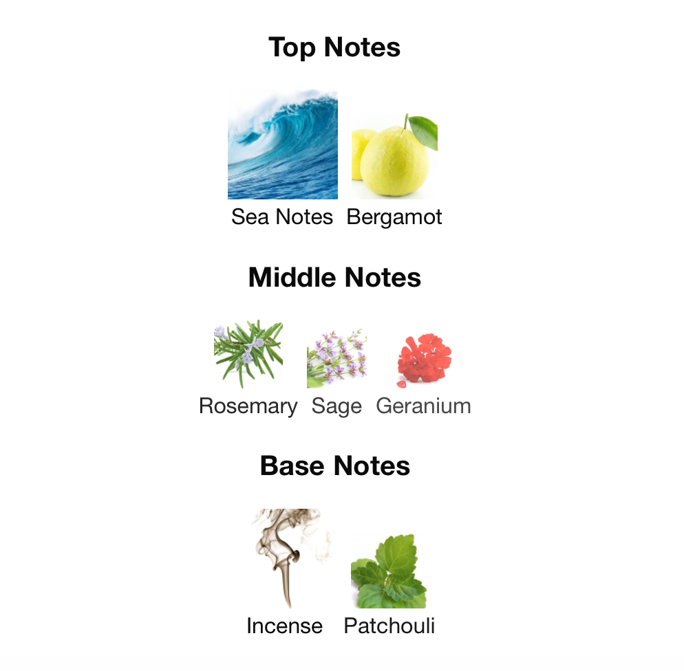 It opens with salty sea notes and sparkling bergamot — instantly invigorating and fresh. The heart builds aromatic character with rosemary, herbal sage, and a touch of floral geranium. The base adds depth and longevity, with smoky incense and earthy patchouli giving the scent a distinctive, masculine trail.