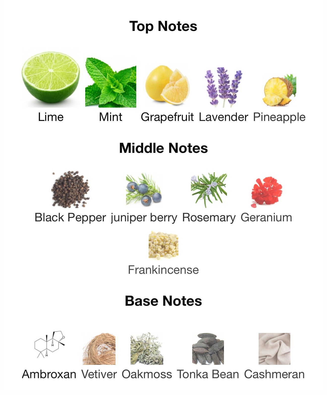 Heart: Juniper Berry, Rosemary, Olibanum Resinoid, Geranium, Black Pepper