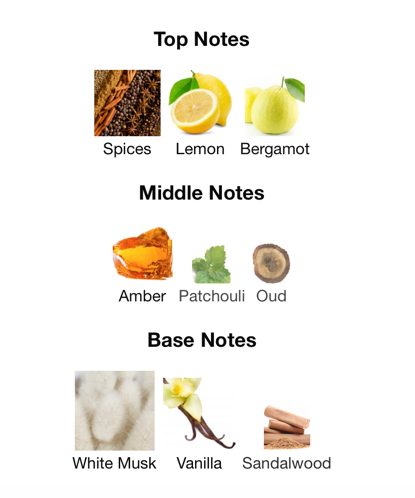 The base lingers with a soft, sensual finish: creamy vanilla, smooth sandalwood, and the clean warmth of white musk. The result is a fragrance that balances bold opulence with smooth elegance, perfect for those who want to leave a lasting impression.
