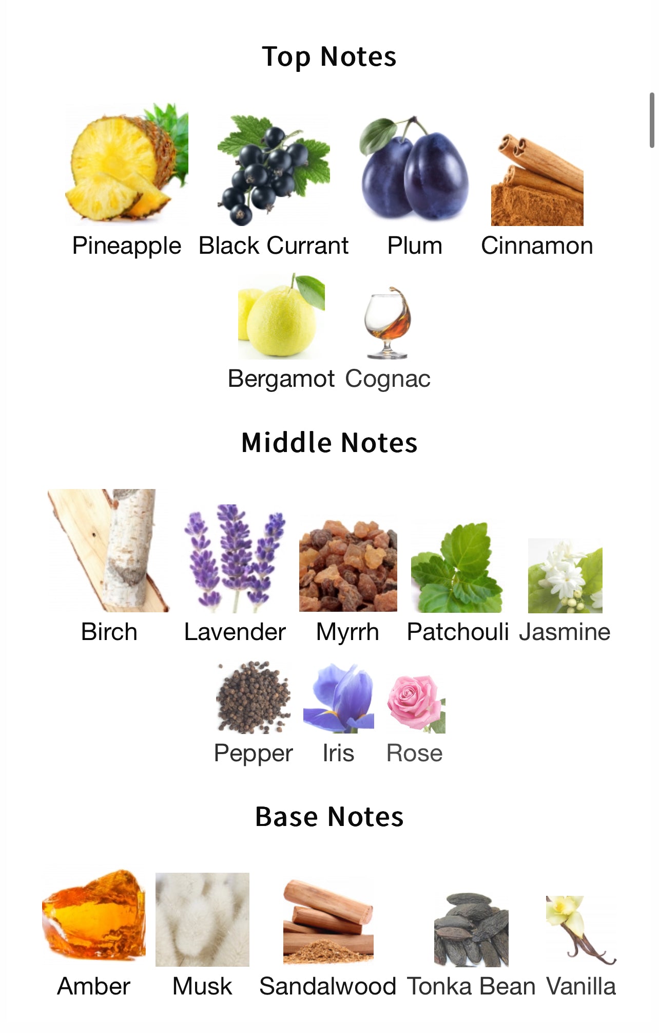 Top: Pineapple, Black Currant, Plum, Cinnamon, Bergamot, Cognac