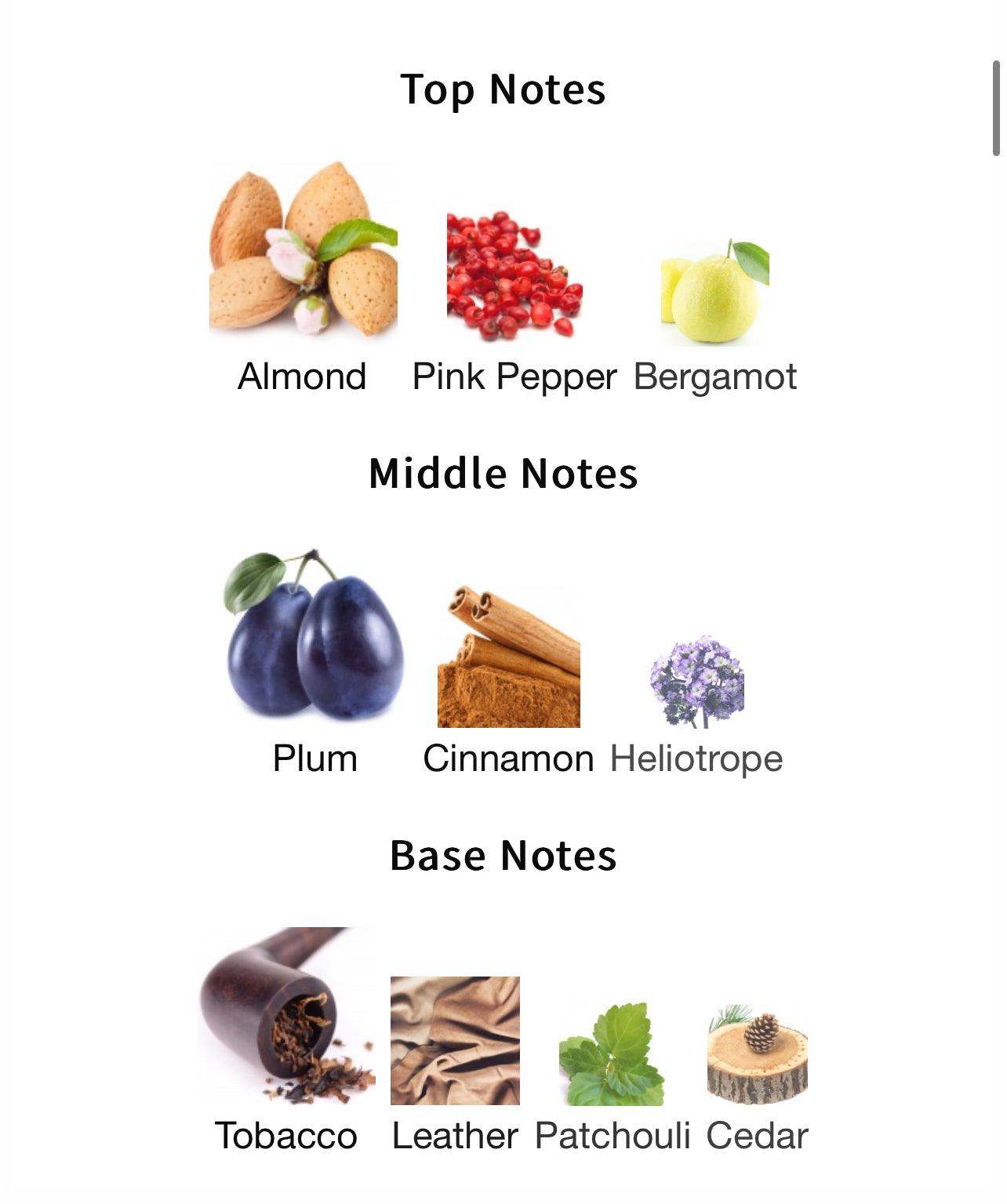 Opens with an addictive almond note, spiced up with pink pepper and bergamot for brightness. The heart builds with juicy plum, warm cinnamon, and soft floral heliotrope. The dry-down settles into a cozy masculine blend of tobacco, leather, patchouli, and cedar — equal parts sexy and comforting.