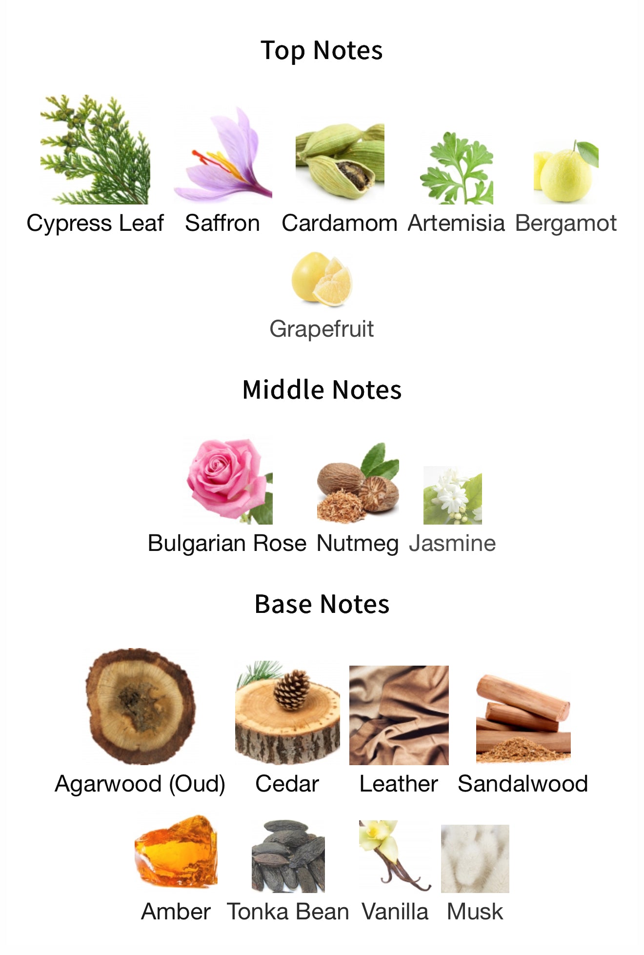 - Top: Cypress Leaf, Saffron, Cardamom, Artemisia, Bergamot, Grapefruit